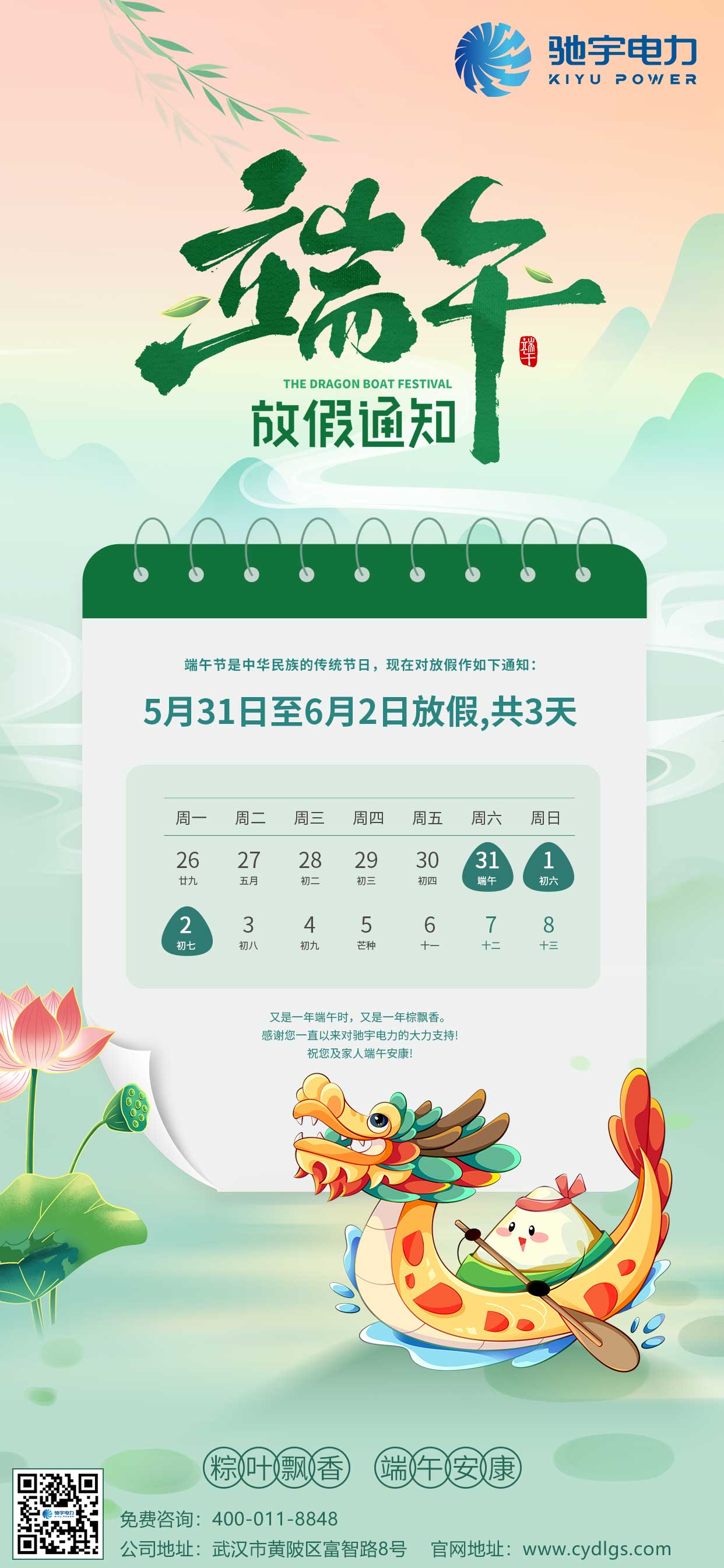 一年一端午,一歲一安康。端午節(jié)即將來臨,根據(jù)《國務(wù)院辦公廳關(guān)于2025 年部分節(jié)假日安排的通知》,結(jié)合我公司實際情況,現(xiàn)將端節(jié)放假安排的有關(guān)事宜通知如下: