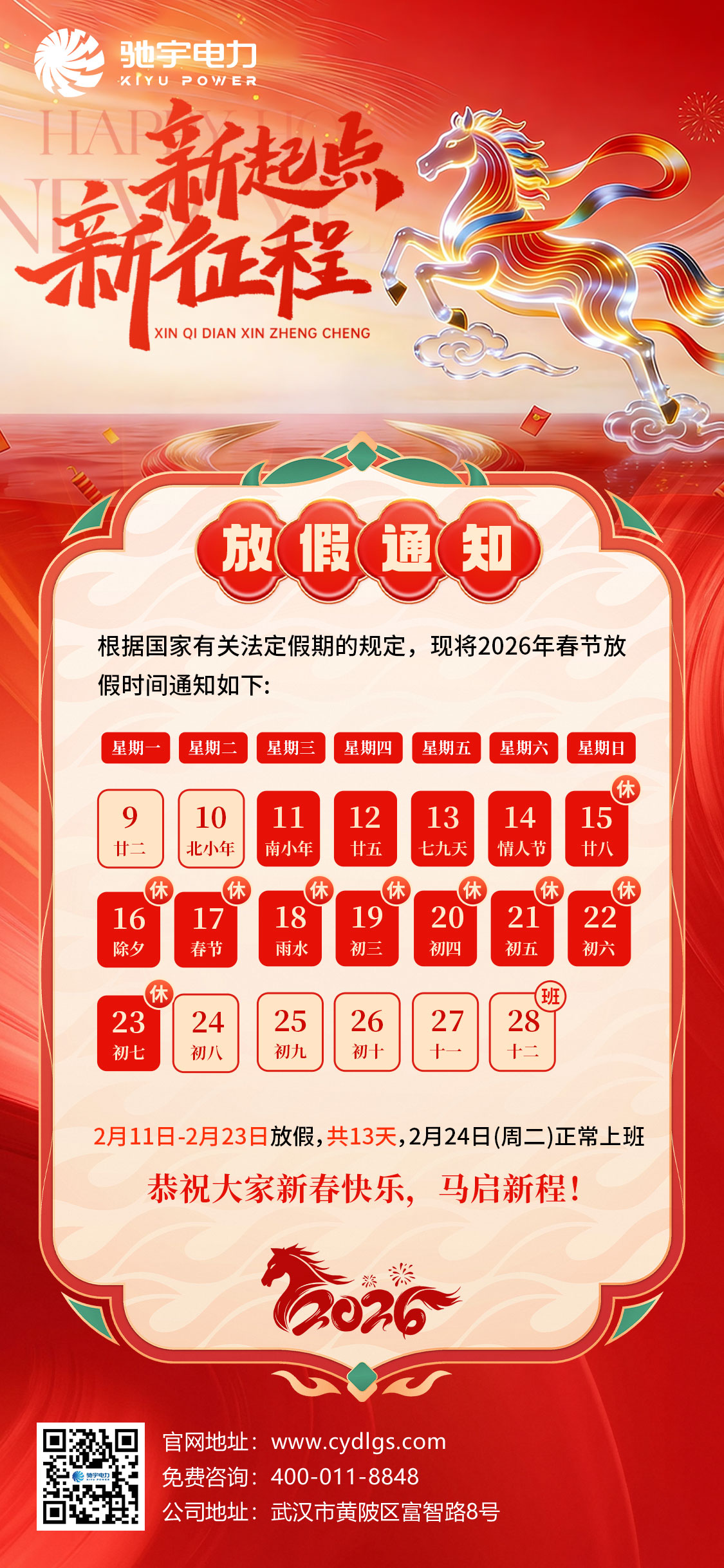 馬踏祥云馱福至,春臨大地報(bào)喜來(lái)。2025年乙已蛇年即將成為過去,我們即將開啟充滿新希望、新機(jī)遇的丙午馬年。根據(jù)《國(guó)務(wù)院辦公廳關(guān)于2026年部分節(jié)假日安排的通知》,結(jié)合我公司實(shí)際情況,現(xiàn)將春節(jié)放假安排的有關(guān)事宜通知如下: